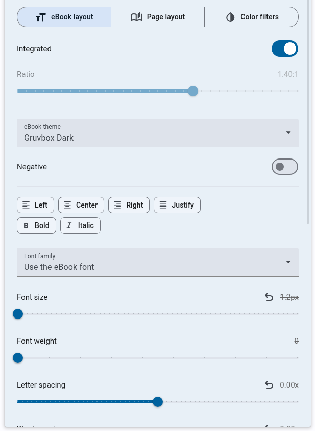 This is the list of all available options in the eBook layout tab and their descriptions.
